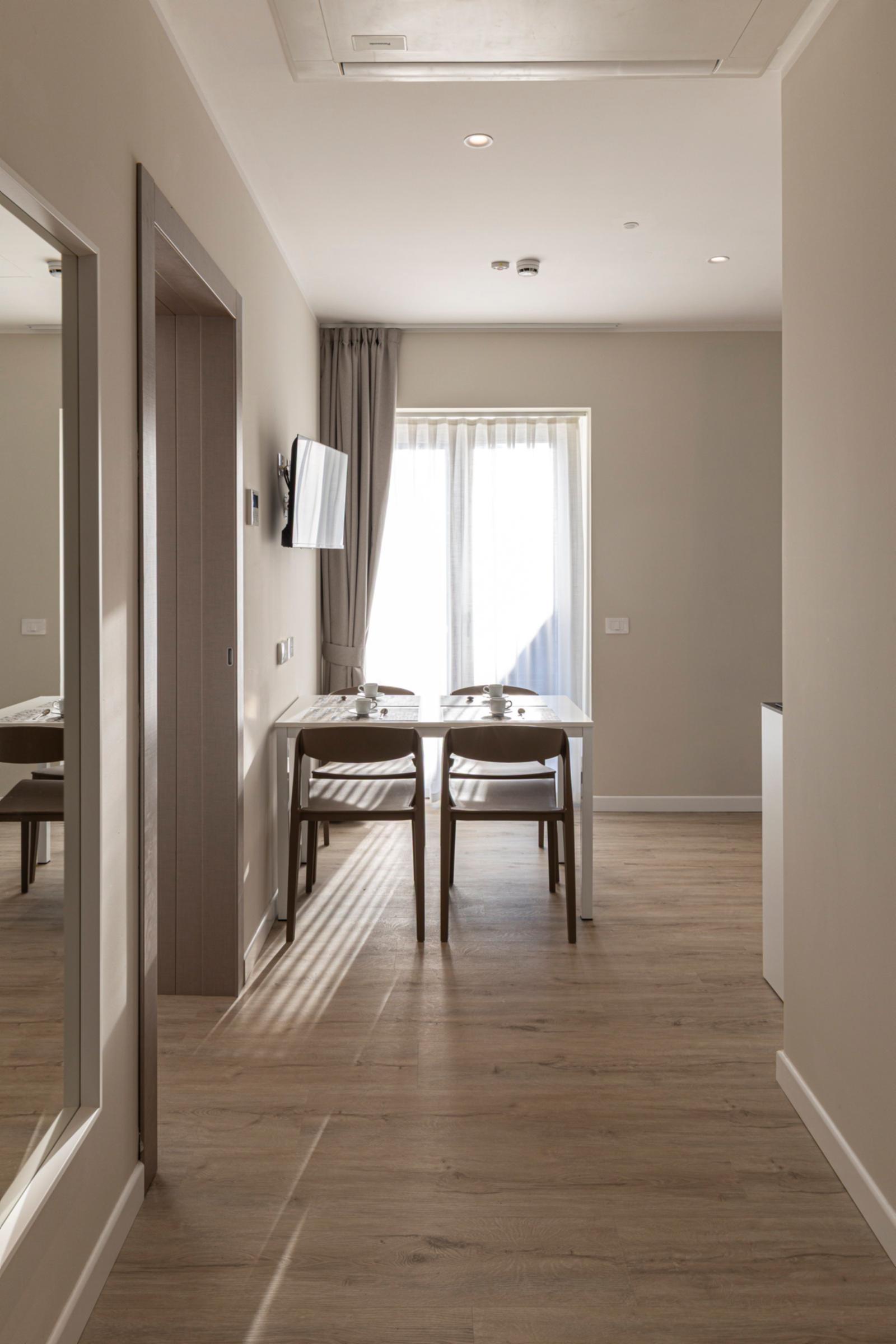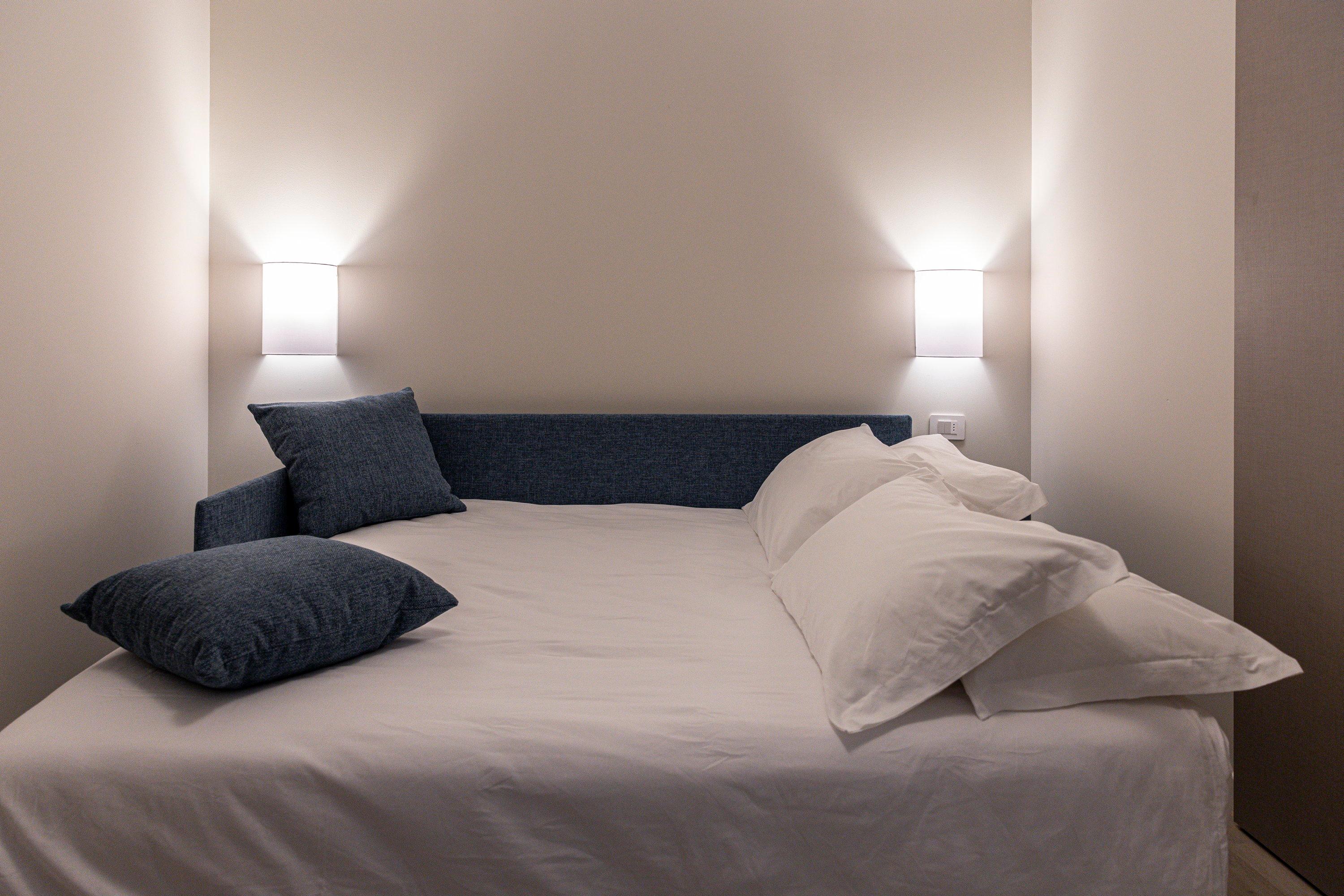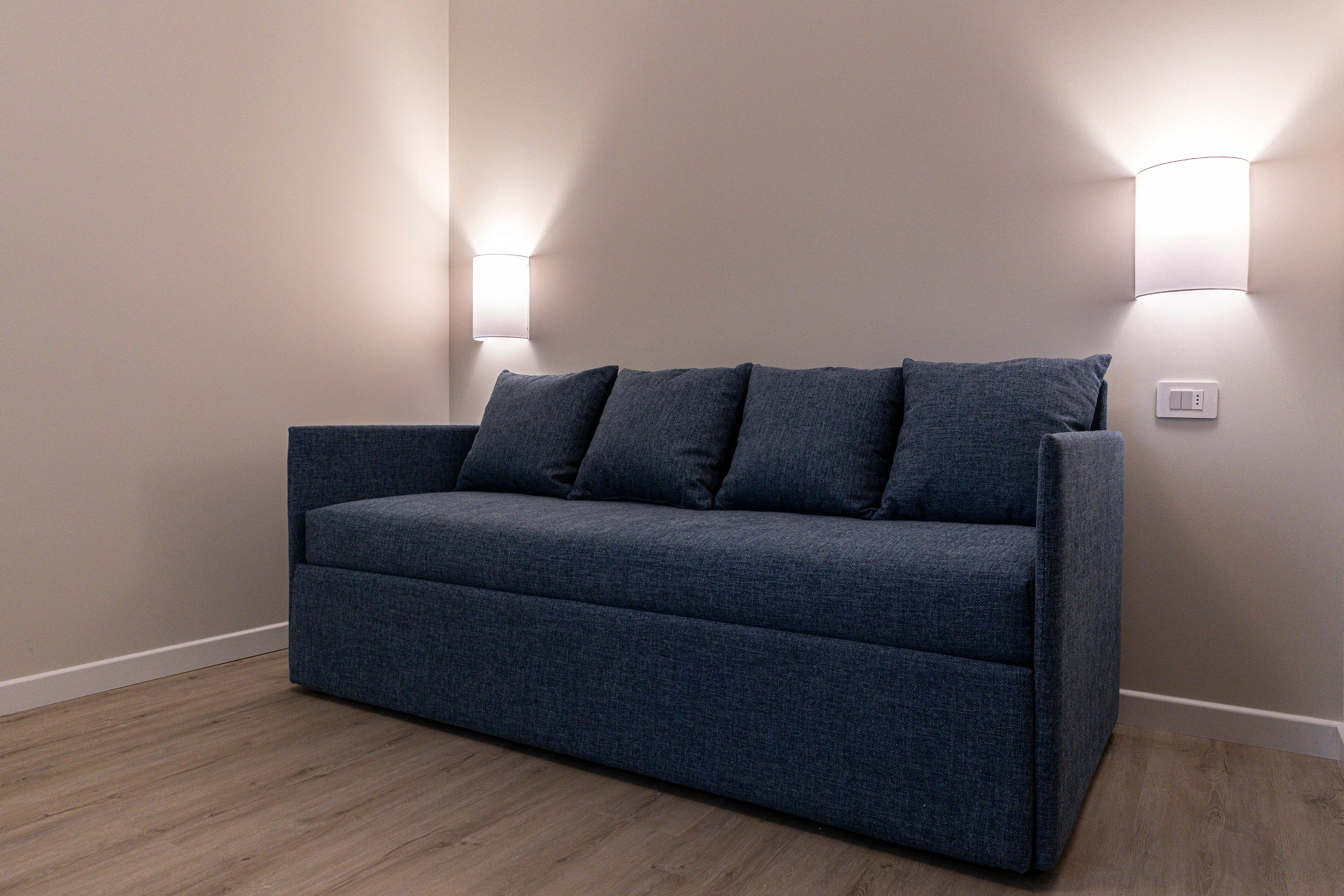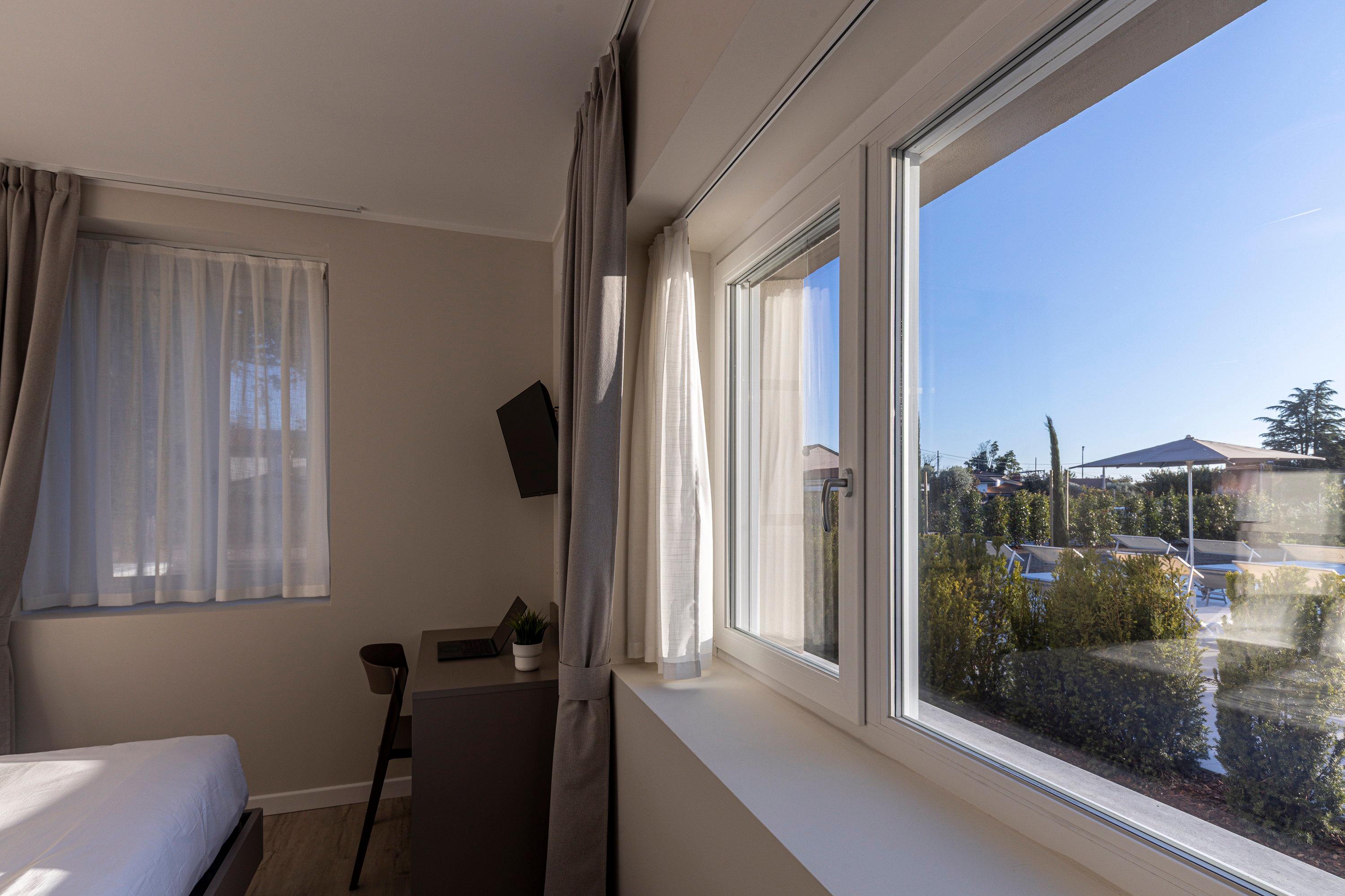 The quadruple room offers a cozy and functional environment, ideal for both holidays and work stays where you can relax and unwind from the daily routine. It features a double bed and a separate room with a sofa bed and desk, increasing its capacity and versatility. The French door opens onto a charming private garden with a pool view, ensuring a bright and peaceful atmosphere. The space is completed by a spacious private bathroom equipped with all comforts for a pleasant and relaxing stay.