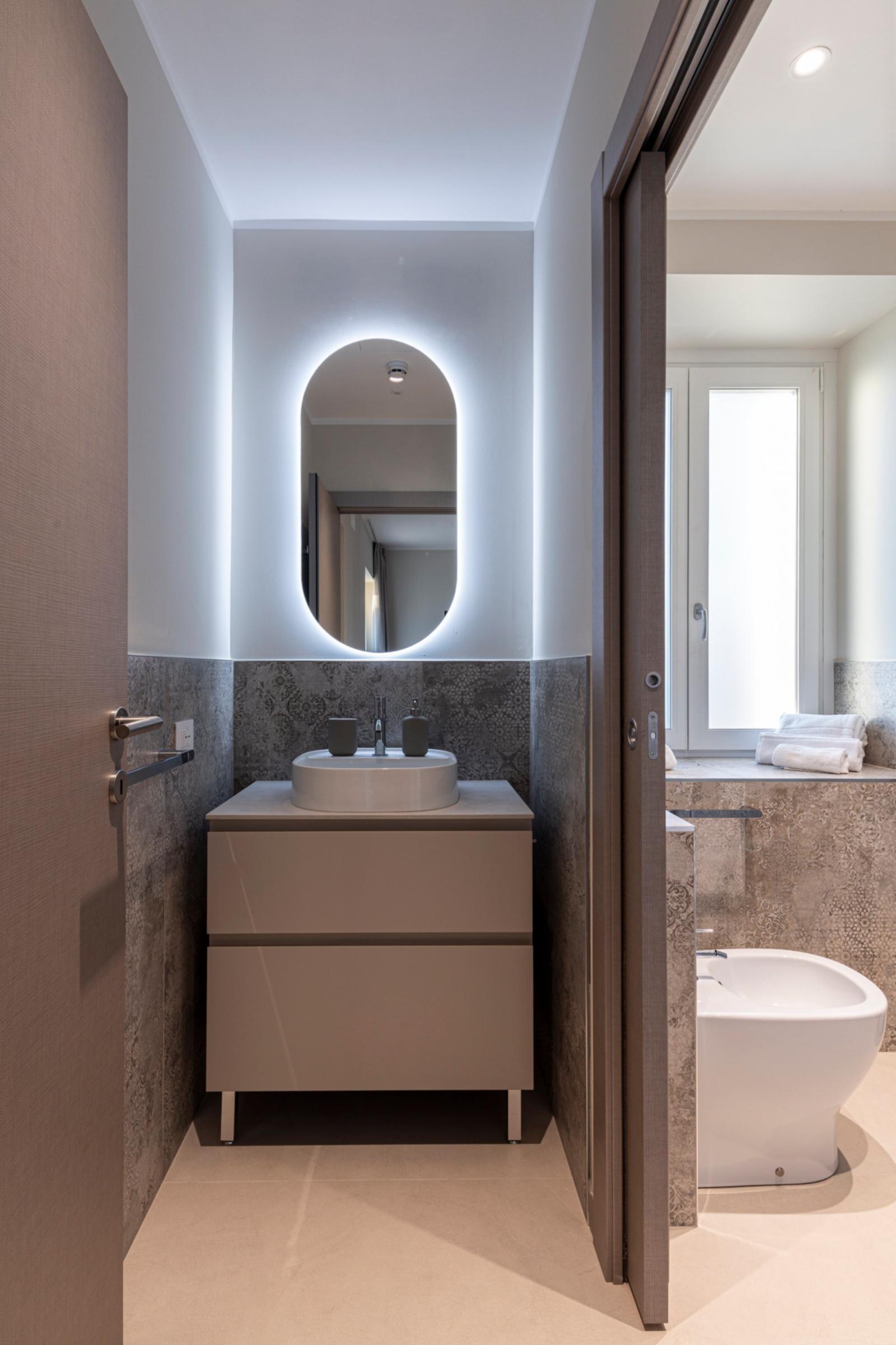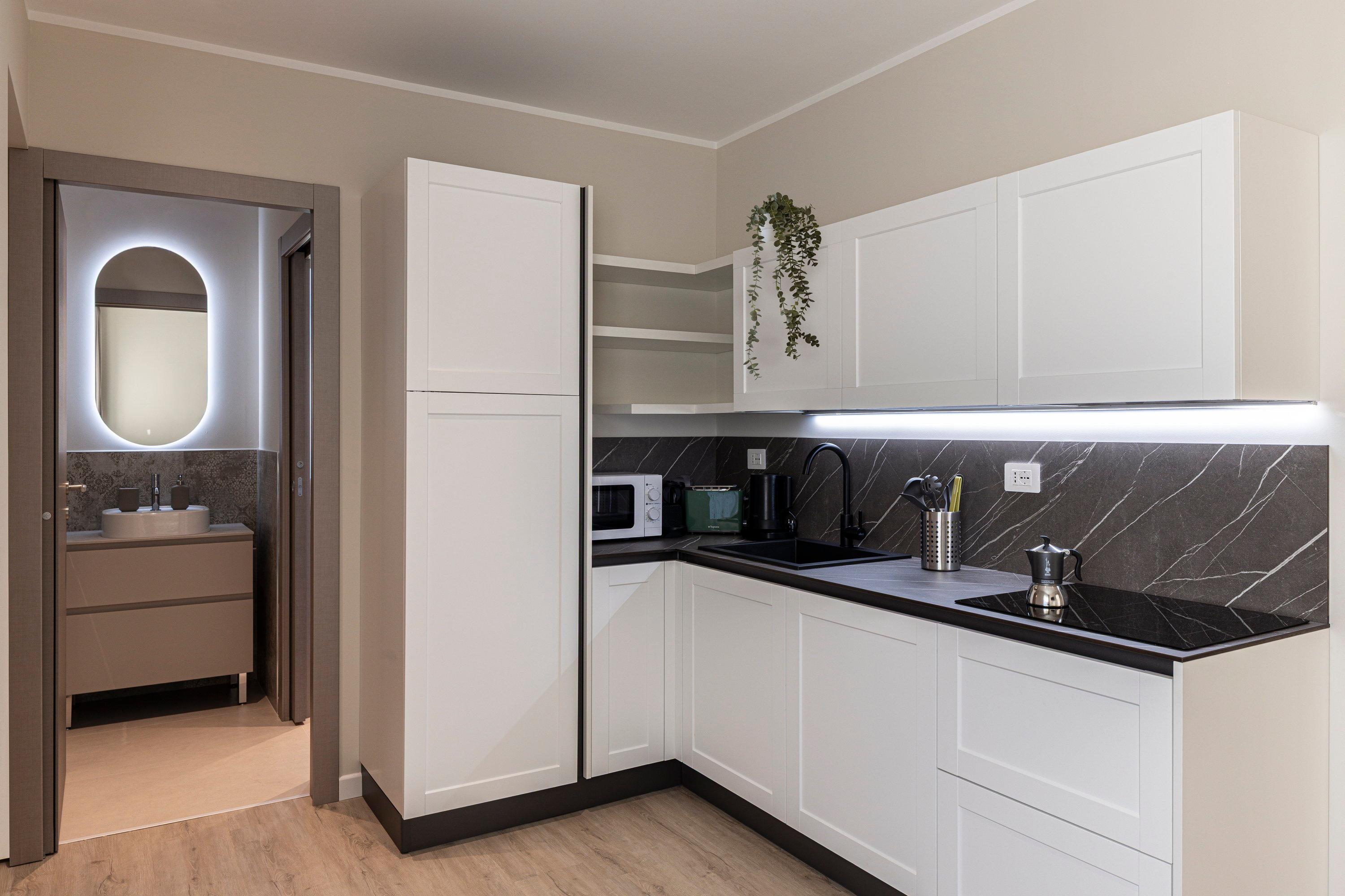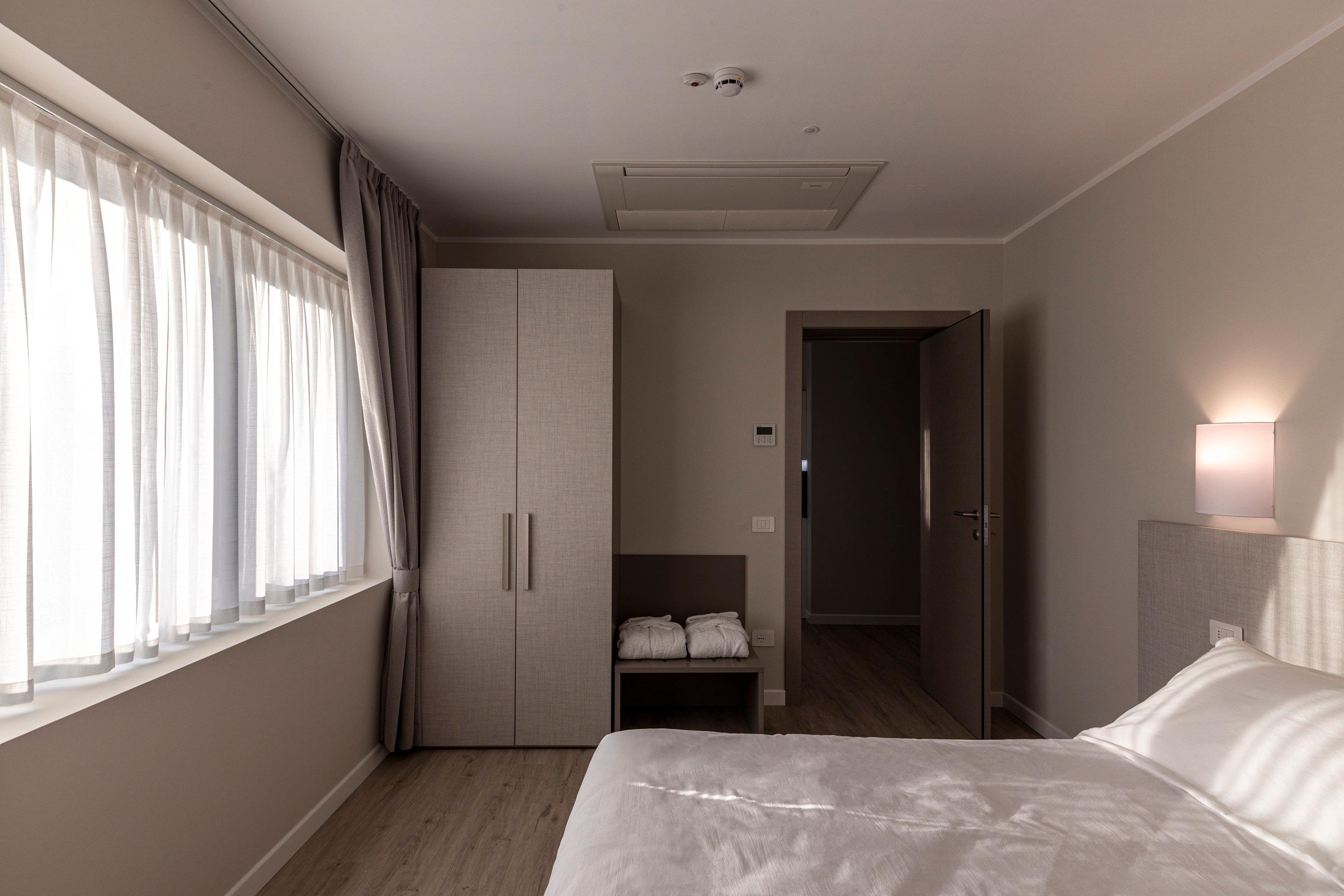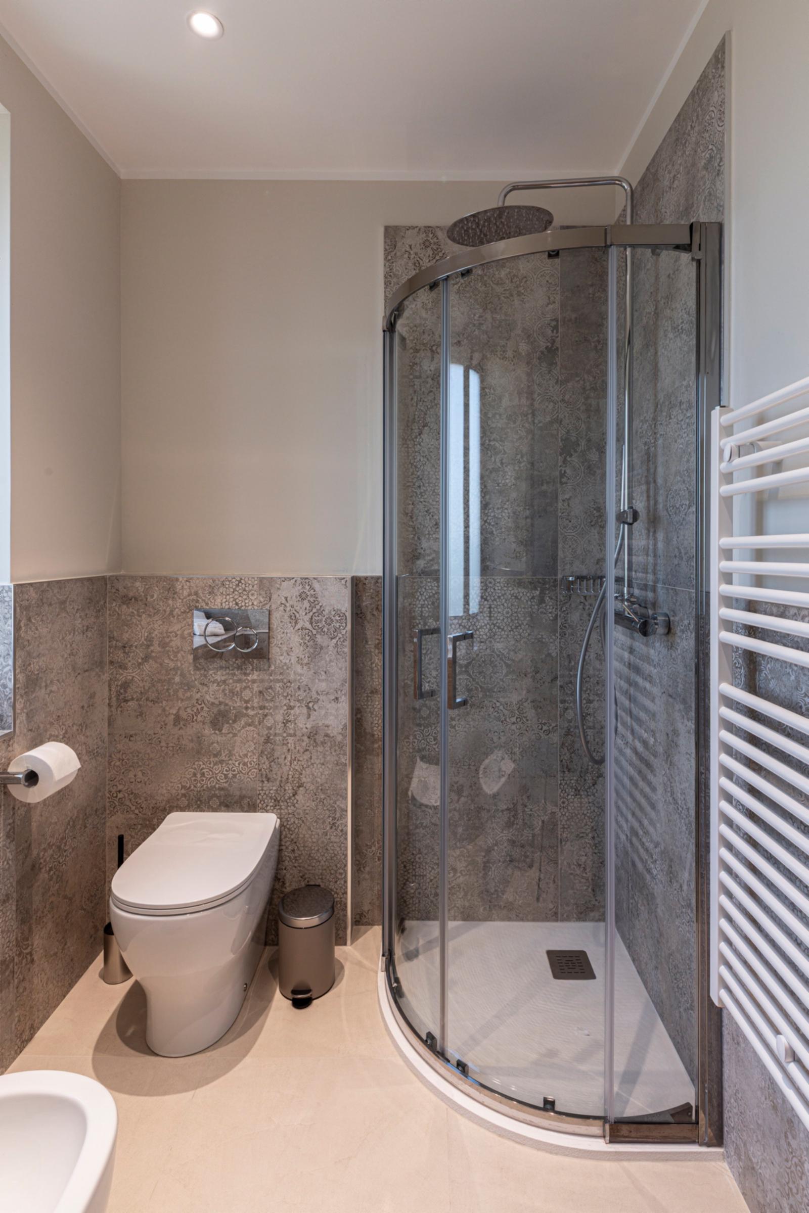 The quadruple room offers a cozy and functional environment, ideal for both holidays and work stays where you can relax and unwind from the daily routine. It features a double bed and a separate room with a sofa bed and desk, increasing its capacity and versatility. The French door opens onto a charming private garden with a pool view, ensuring a bright and peaceful atmosphere. The space is completed by a spacious private bathroom equipped with all comforts for a pleasant and relaxing stay.