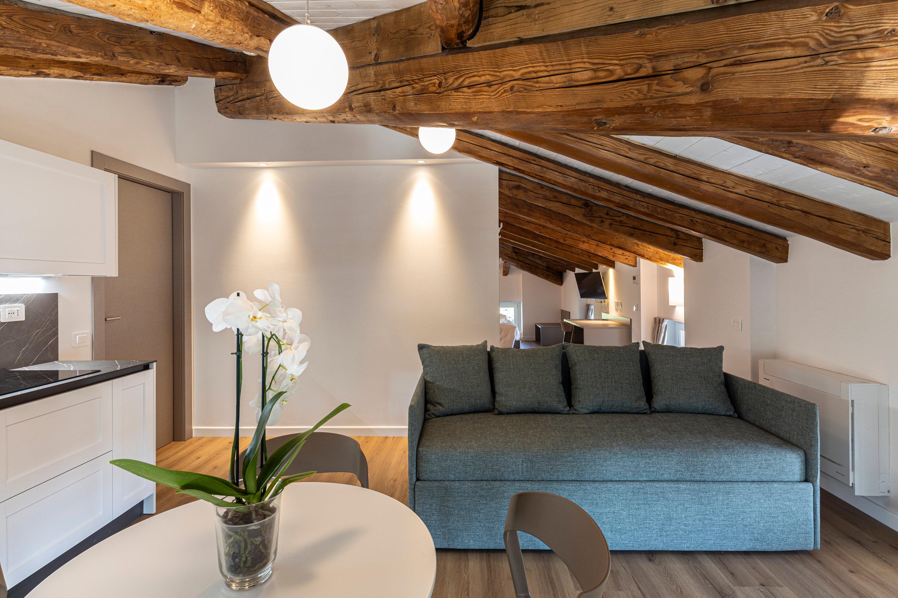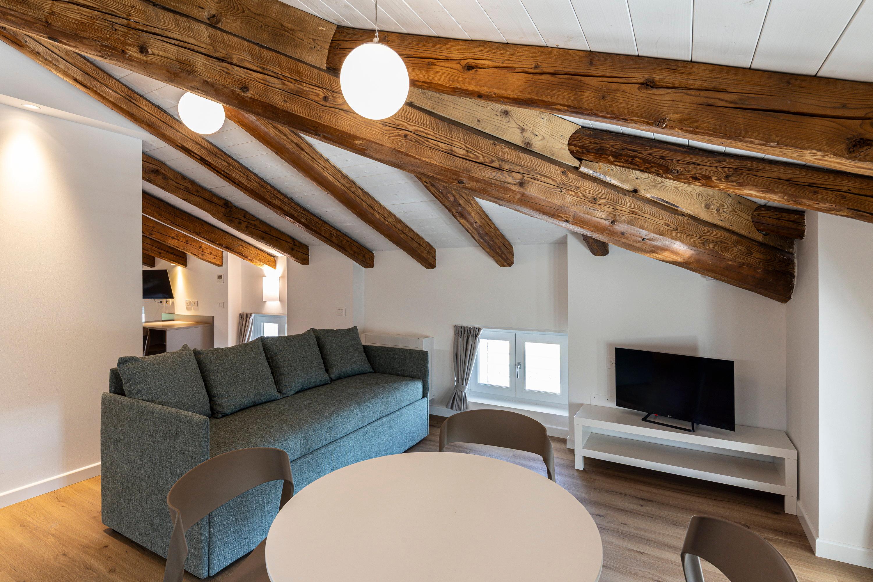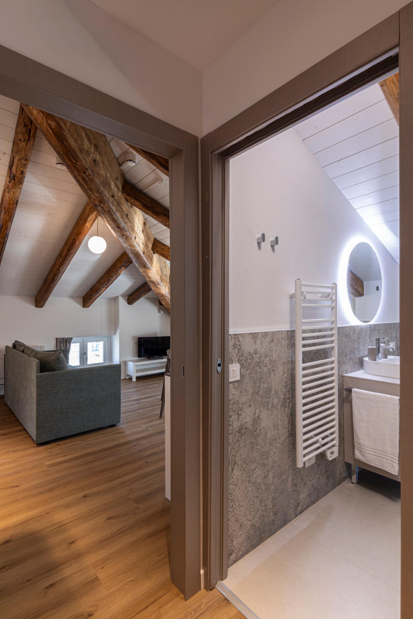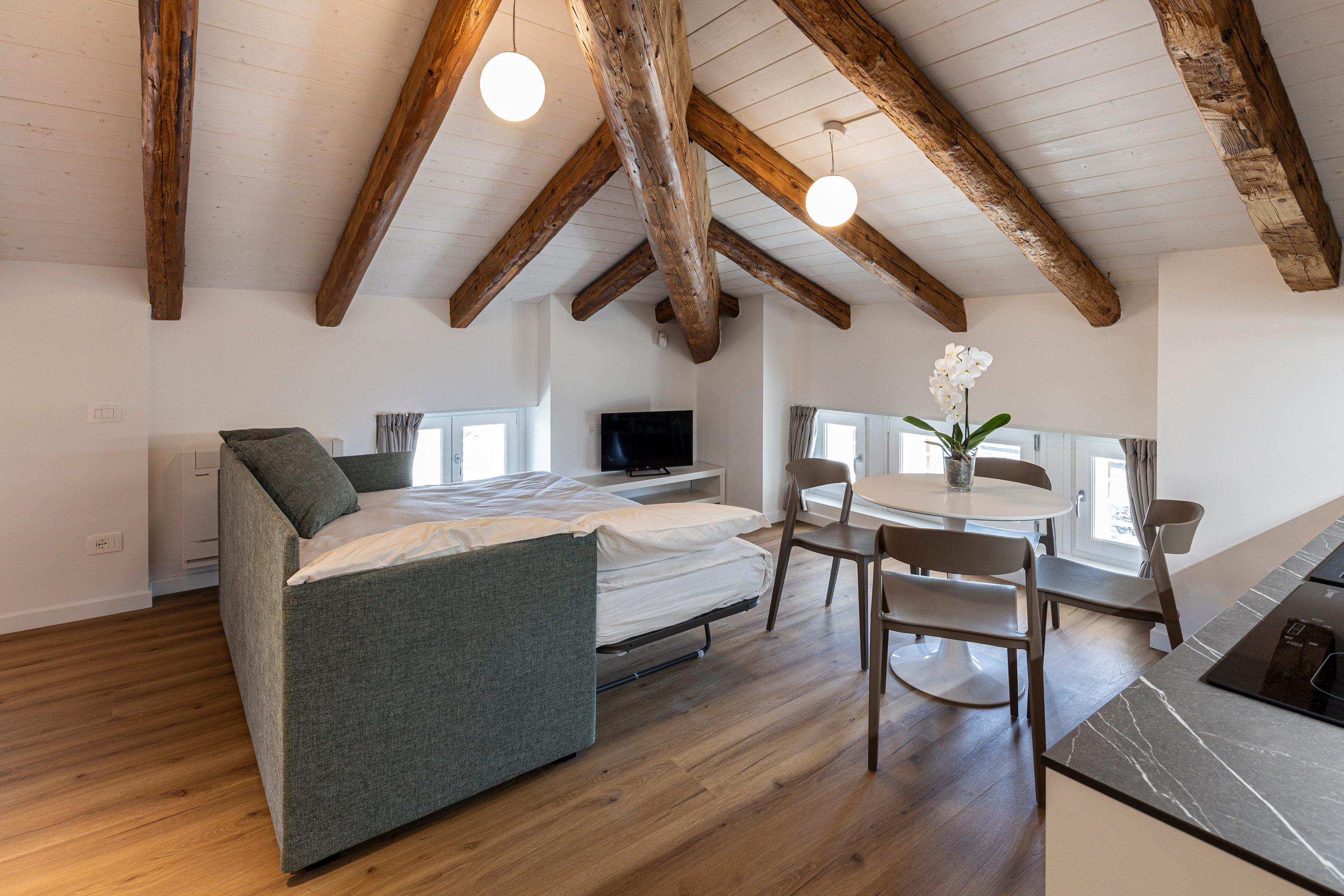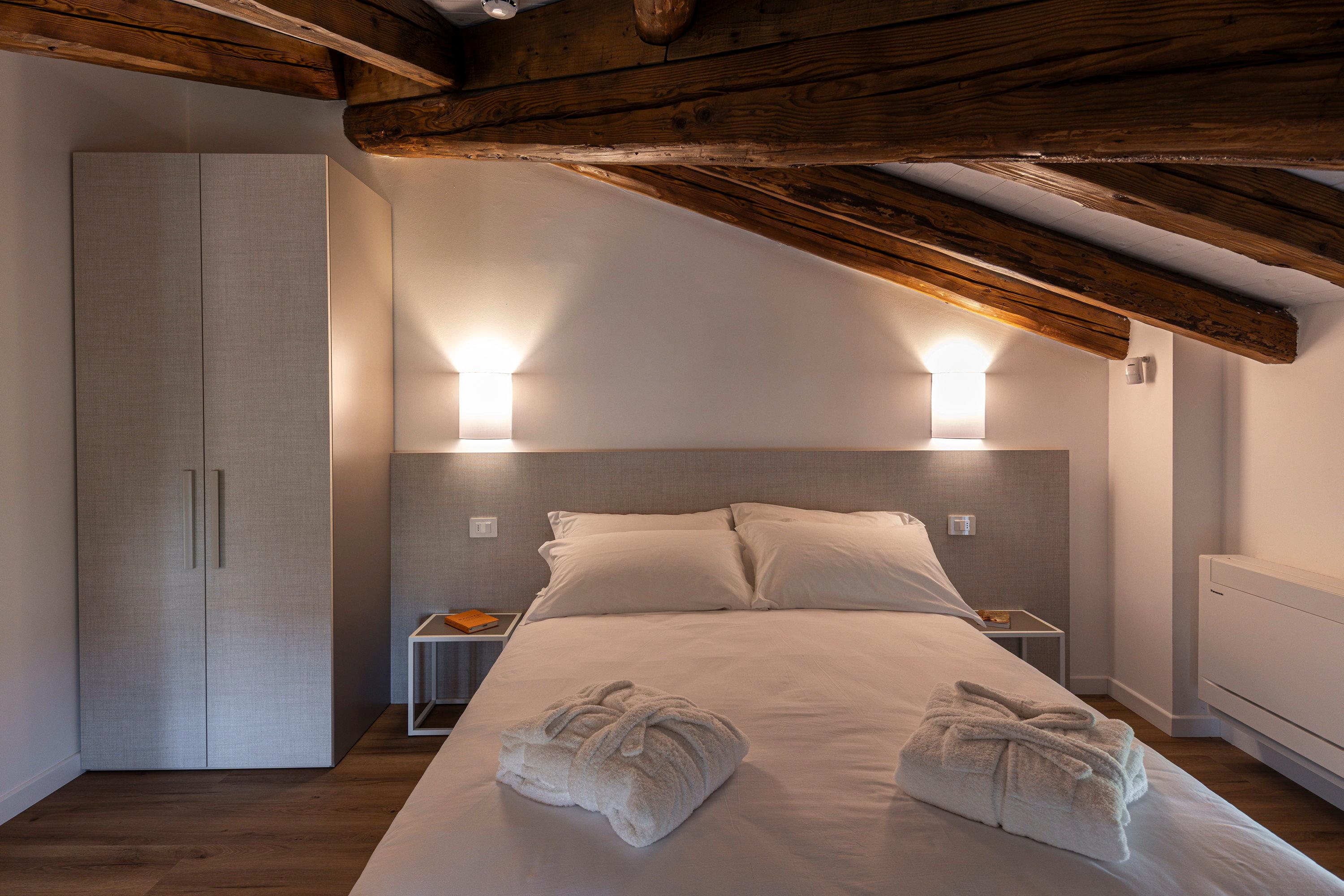 The spacious and cozy attic one-bedroom apartment can accommodate up to 4 guests. Exposed beams create a warm and inviting atmosphere, perfectly harmonized with the modern charm of the most exclusive hospitality solutions, typical of prestigious mountain destinations. A space where comfort and style blend seamlessly to offer a relaxing and unforgettable stay, complemented by a private bathroom that ensures privacy and functionality.