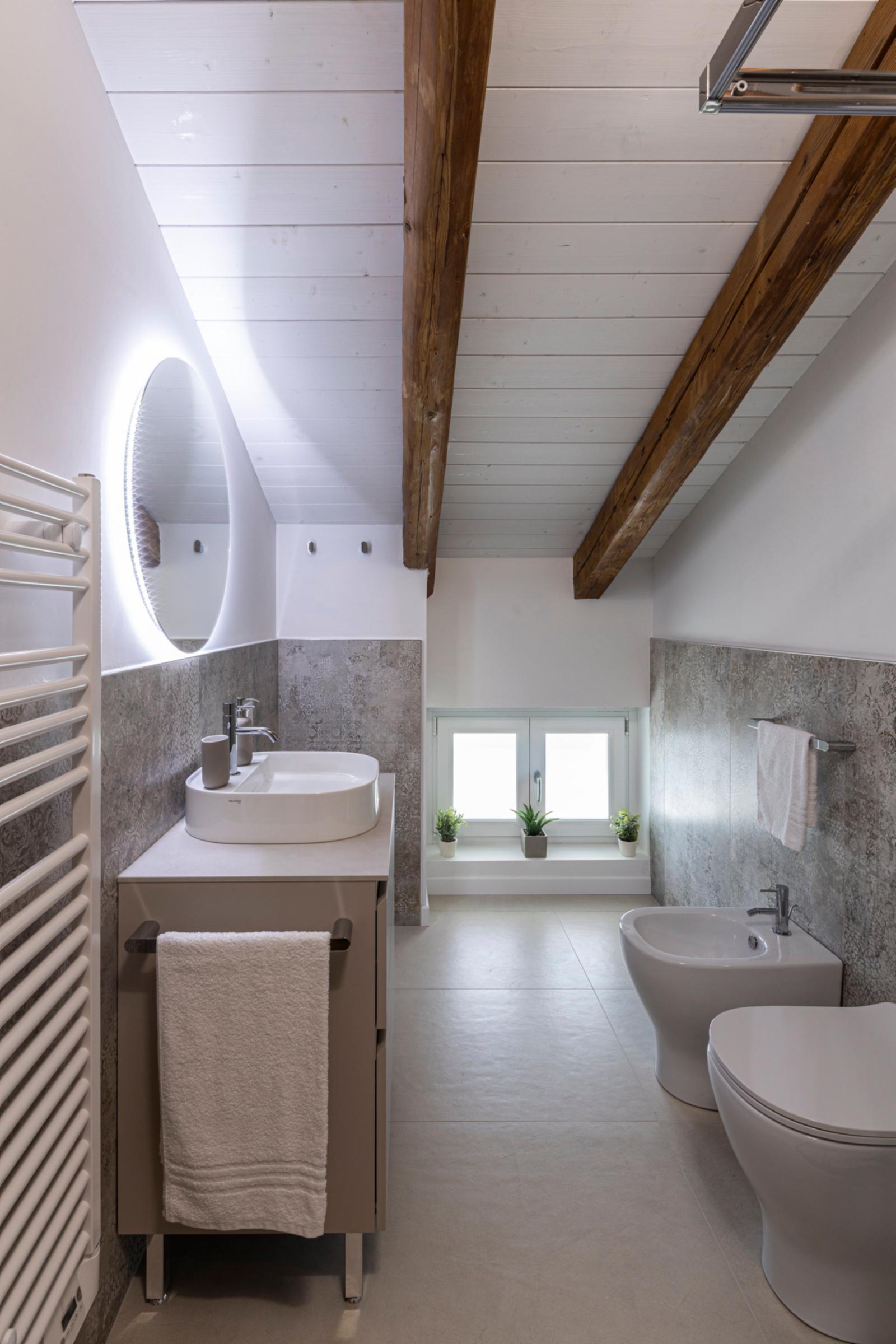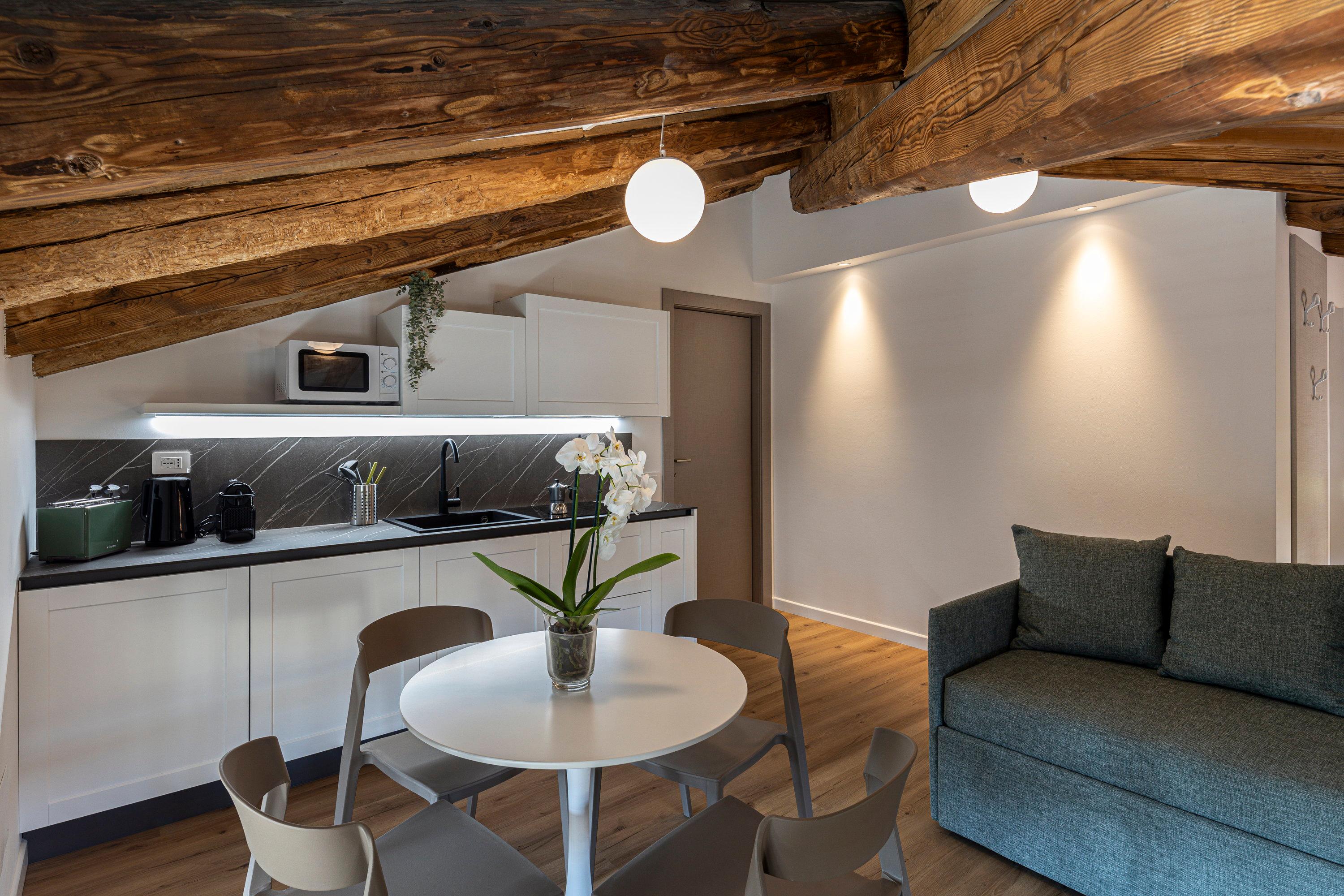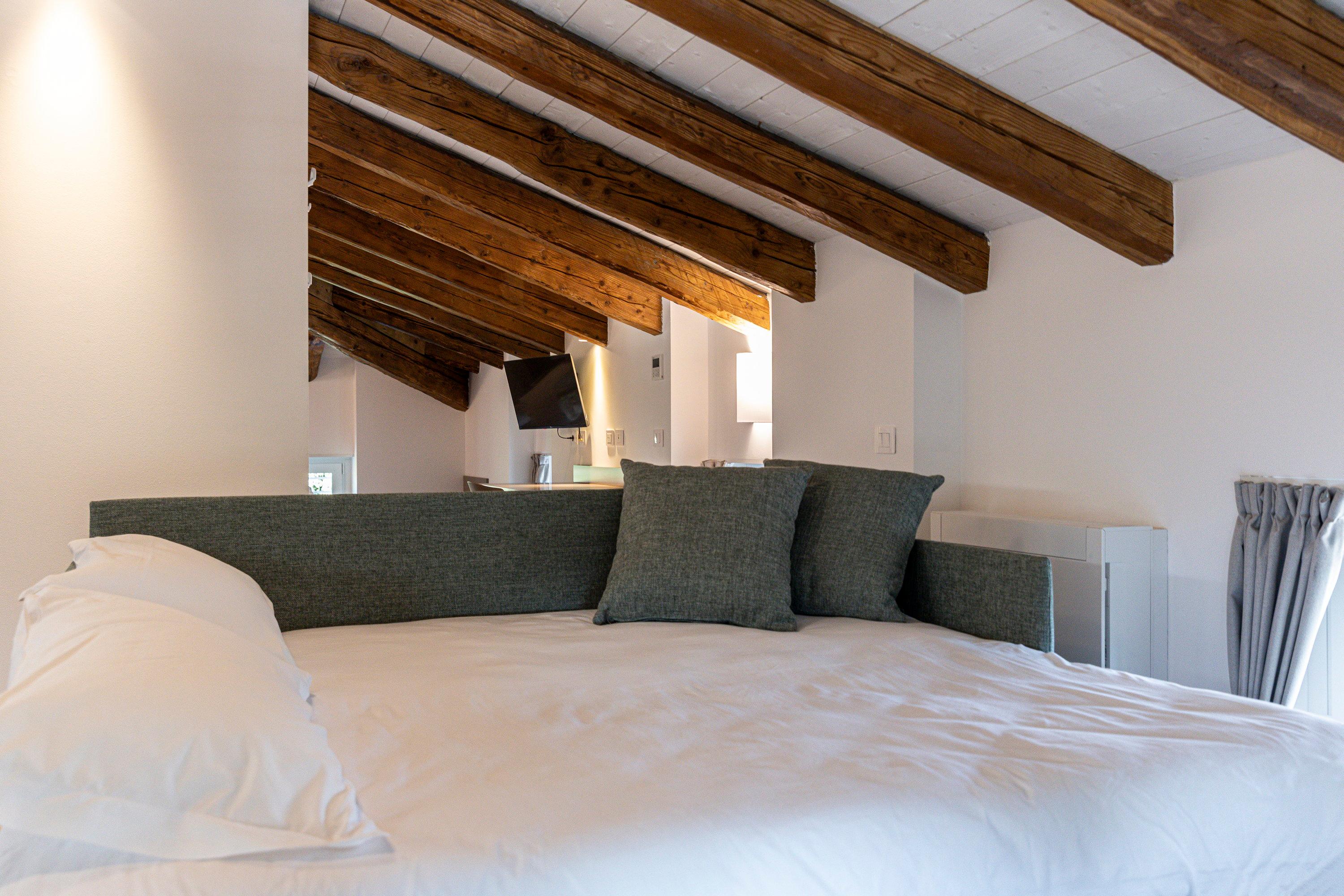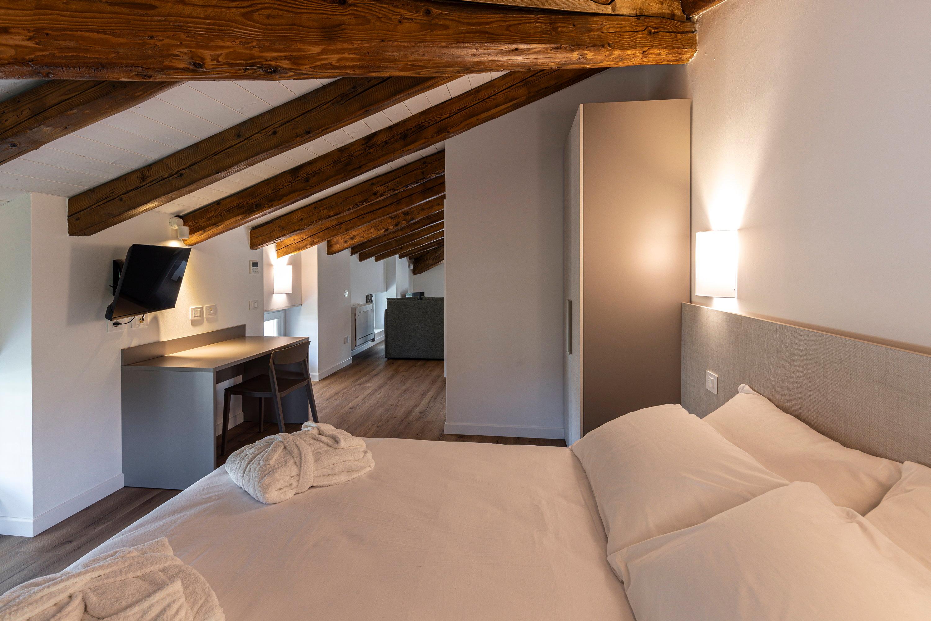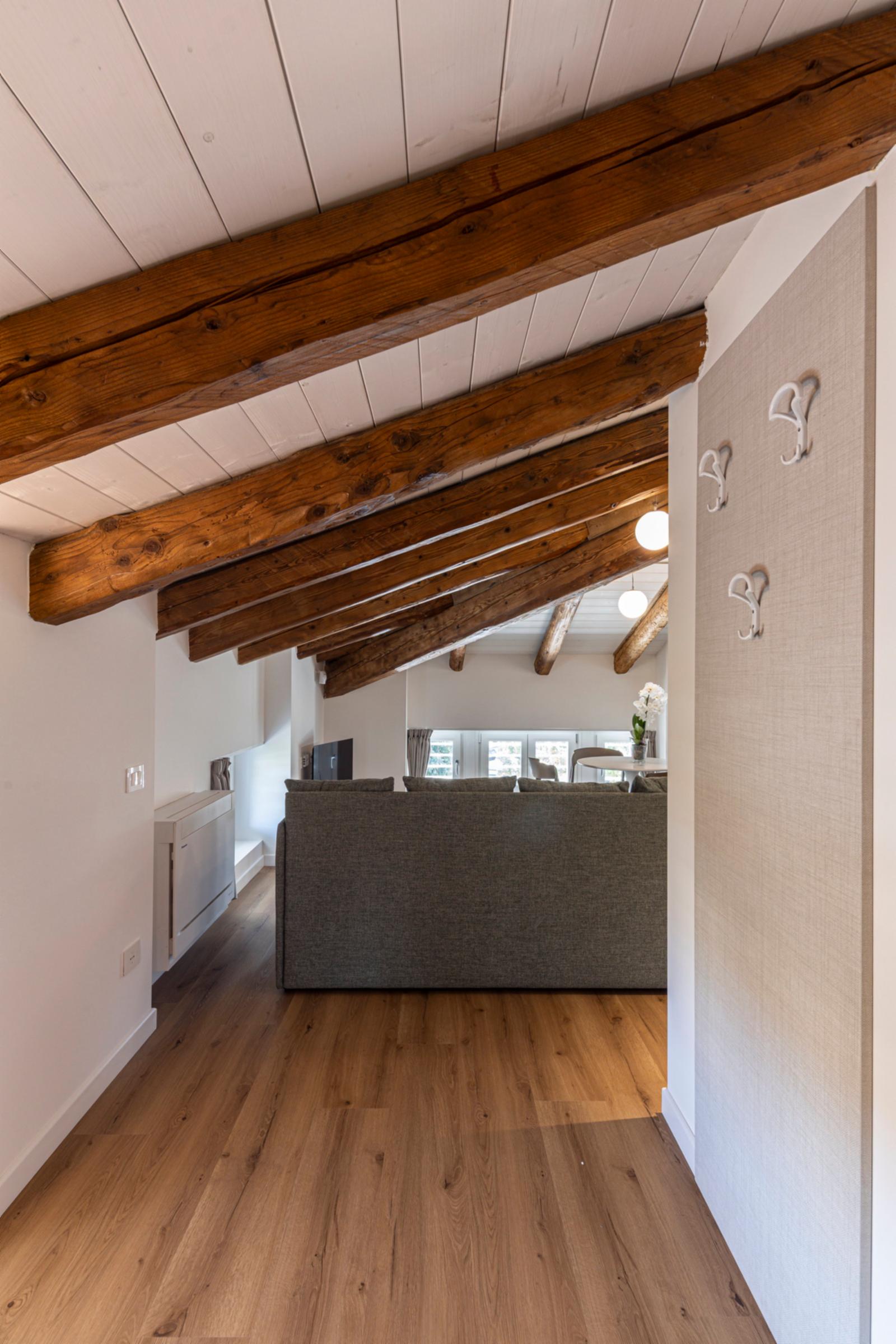 The spacious and cozy attic one-bedroom apartment can accommodate up to 4 guests. Exposed beams create a warm and inviting atmosphere, perfectly harmonized with the modern charm of the most exclusive hospitality solutions, typical of prestigious mountain destinations. A space where comfort and style blend seamlessly to offer a relaxing and unforgettable stay, complemented by a private bathroom that ensures privacy and functionality.