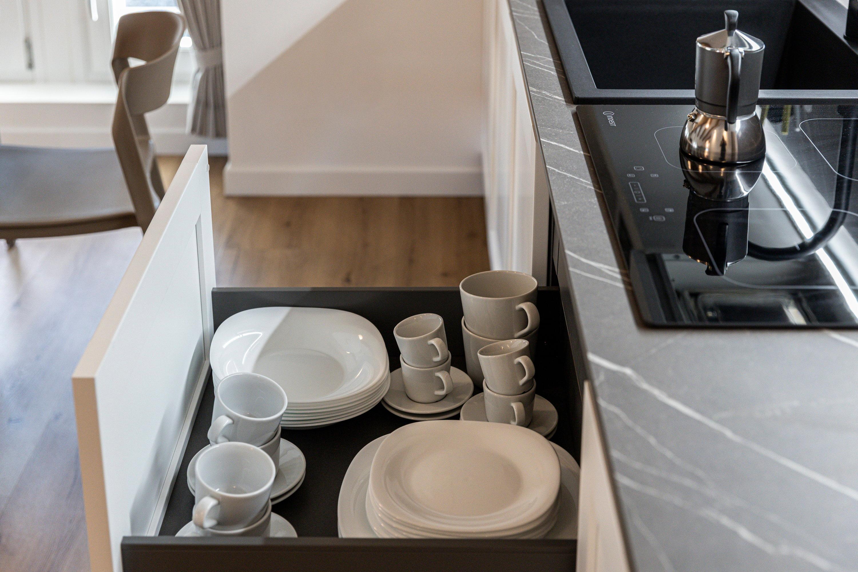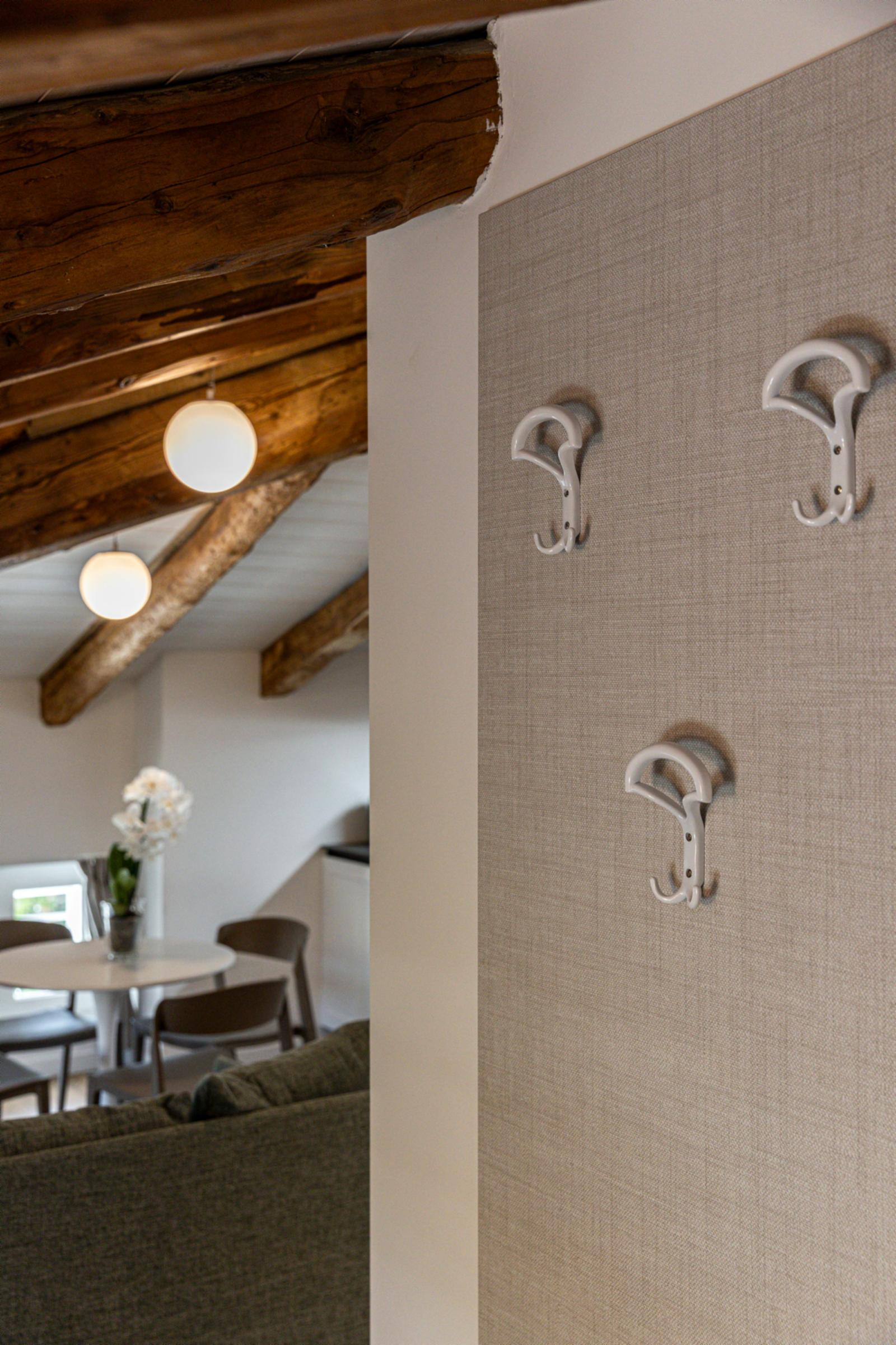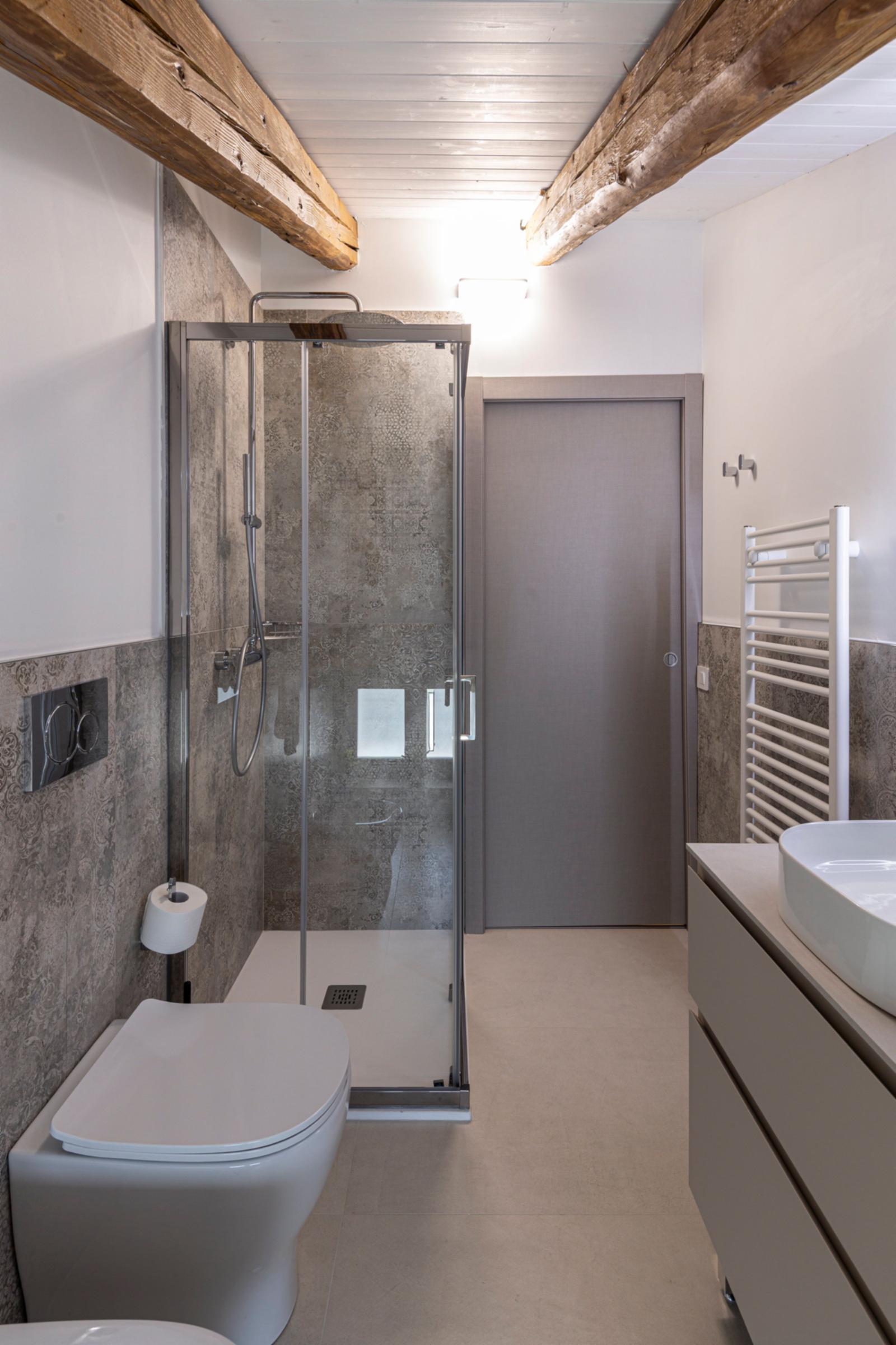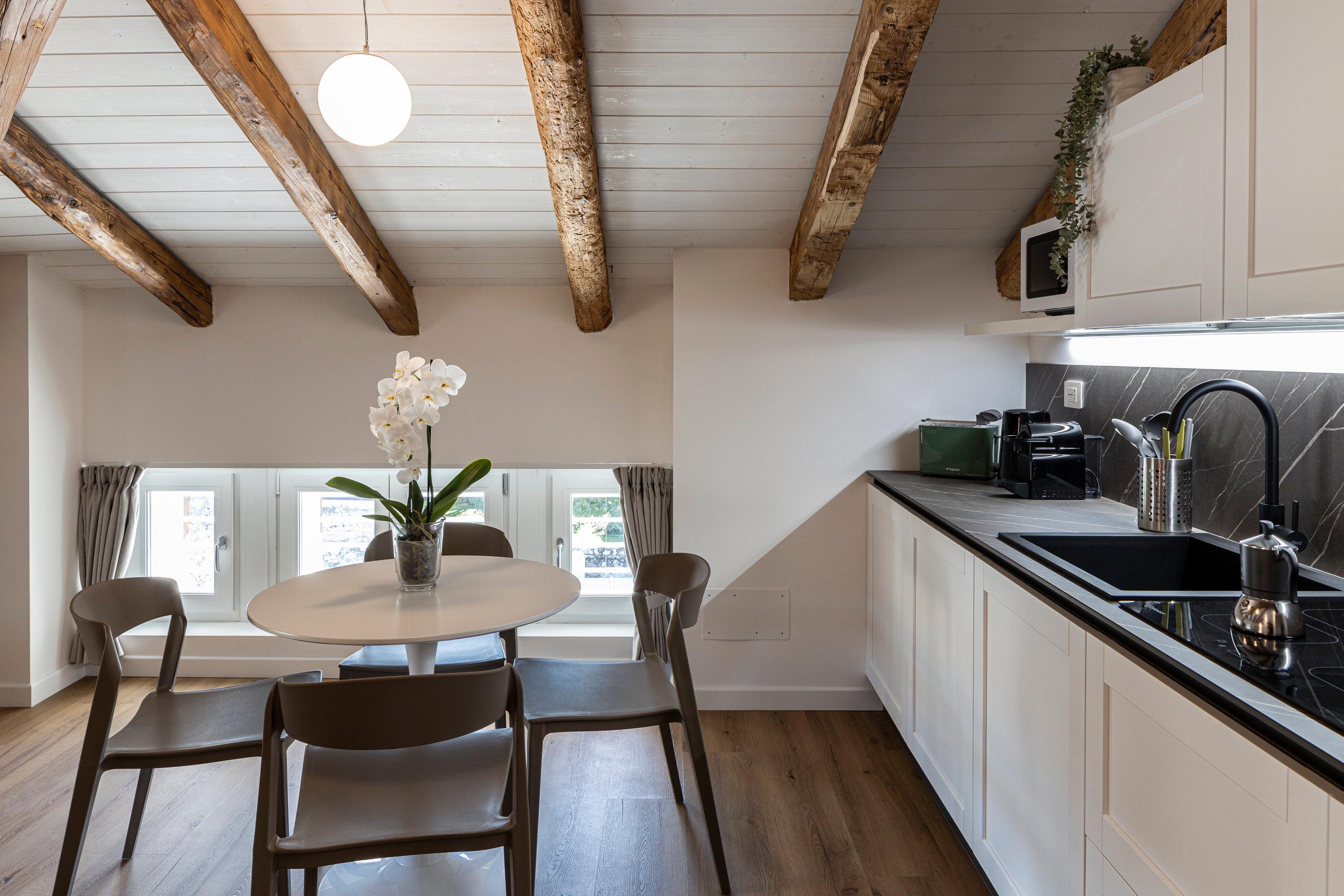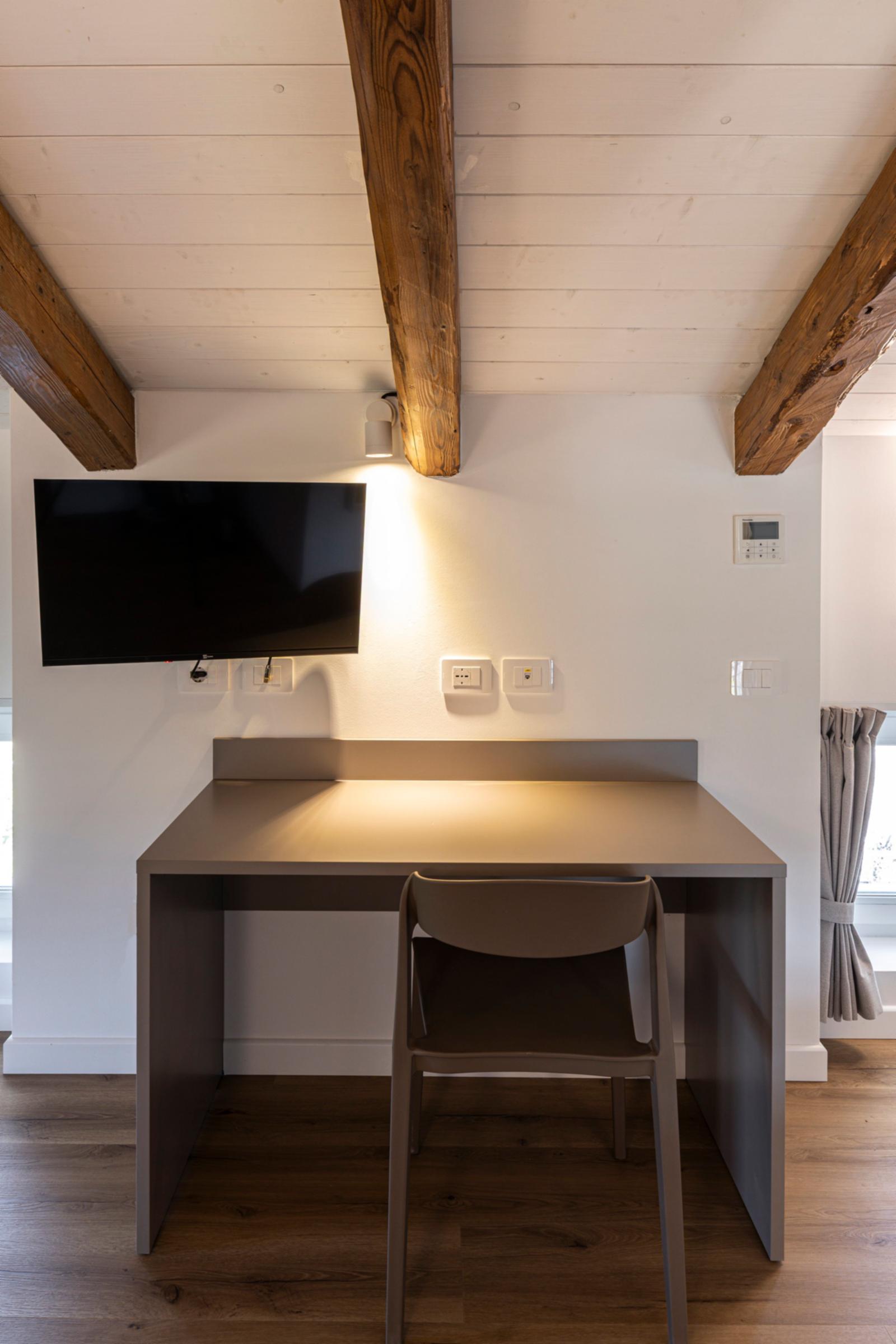 The spacious and cozy attic one-bedroom apartment can accommodate up to 4 guests. Exposed beams create a warm and inviting atmosphere, perfectly harmonized with the modern charm of the most exclusive hospitality solutions, typical of prestigious mountain destinations. A space where comfort and style blend seamlessly to offer a relaxing and unforgettable stay, complemented by a private bathroom that ensures privacy and functionality.